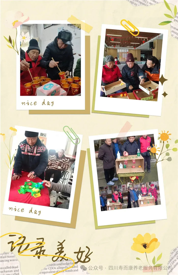 從初一到初七,甜蜜與歡樂(lè )充盈每一天。初一,熱騰騰的湯圓上桌,寓意團圓甜蜜。隨后幾日,各院的春節游園活動(dòng)精彩紛呈:蒙眼猜盲盒、唱紅歌、夾杯子、乒乓球游戲等,老人們積極參與,智慧與熱情并存,現場(chǎng)氣氛熱烈。初七,新年寄語(yǔ)活動(dòng)溫情延續,員工橫幅上滿(mǎn)載對老人的祝福與感激,滾可樂(lè )蛇年大吉游戲更添驚喜歡樂(lè ),老人們歡呼雀躍,整個(gè)春節洋溢著(zhù)溫暖與喜悅。